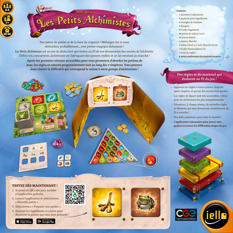 Prévu pour 2 à 4 joueurs, à partir de 7 ans, il vous plonge dans l'univers d'un apprenti alchimiste explorant la cave mystérieuse de son grand-père. Découvrez des fioles étranges, des ingrédients secrets et déverrouillez progressivement des niveaux avec des boîtes mystères qui rendent chaque partie différente de la précédente. L'évolution du jeu est un véritable parcours initiatique où les joueurs gagnent en savoir-faire et en habileté, tout en se rapprochant de l'expérience initiée par "Alchimistes".