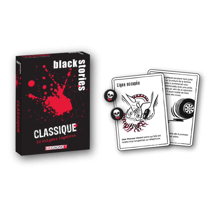 50 Black Stories, 31 crimes, 49 cadavres, 11 meurtriers, 12 suicides et un repas fatal... Les Black Stories sont des énigmes sinistres qui pousseront les joueurs à réfléchir différemment pour les résoudre. Reconstituez chaque situation en posant des questions simples au maître de l'énigme, en étudiant les réponses minutieusement et en laissant votre imagination vous guider. Un jeu terrifiant idéal pour animer une soirée entre amis !