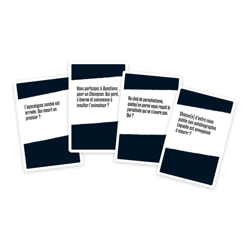 C’est très simple : à votre tour, vous piochez 1 carte avec 1 question, puis tout le monde vote pour la réponse. Vous devez désigner quelqu’un. Vous ne pouvez pas vous désigner vous-même.